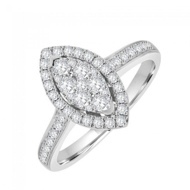 An array of brilliant cut diamonds are intricately arranged and subtely set to create the illusion of a Marquise shaped stone within a Diamond halo surround. The silky and luxurious 18ct White Gold setting is perfect wedding ring fit, making the perfect engagement ring!