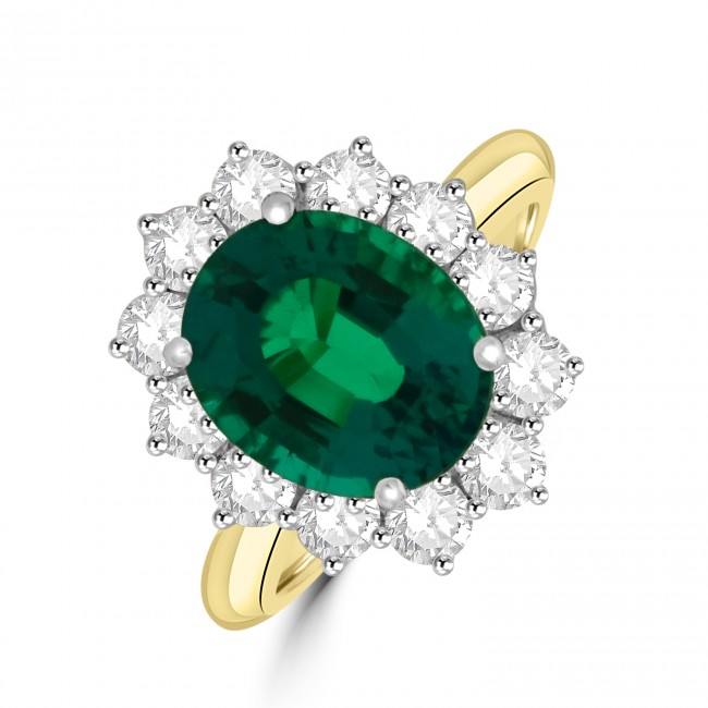 A hugely impressive, vibrant green Emerald weighs 3.57ct in a beautifully proportioned, oval cut. Brasilian in origin, the natural gemstone has undergone re-crystallised diffusion to permanently enhance its dazzling aesthetics. The properties of an emerald remain unchanged. Set within a surround of twelve, round brilliant cut diamonds the cluster is traditionally clawed in 18ct white gold with a yellow gold shank.