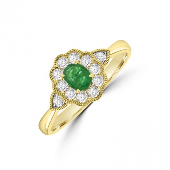 This beautifully designed, emerald and diamond ring features a traditional, oval cluster in centre focus. An additional diamond on each shoulder is encased in a leaf shape and offers a unique twist to the design. The outlining edges are millegrain cut to offer "that vintage look". The majestic, 18ct yellow gold mount offers a perfect wedding ring fit.