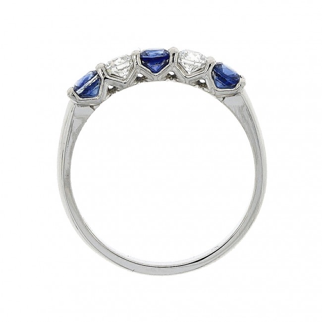 Three round cut Blue Sapphires are alternated with two brilliant white diamonds in a shared 4-claw setting in luxurious platinum. The side profile displays the sequence of stones beautifully contoured with an open V-shaped collet to reveal full side profile of the precious gemstones.