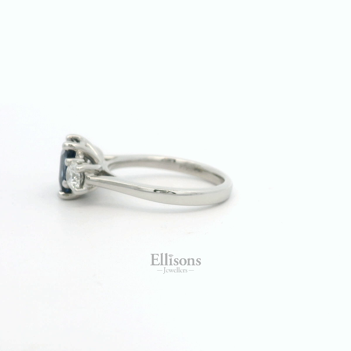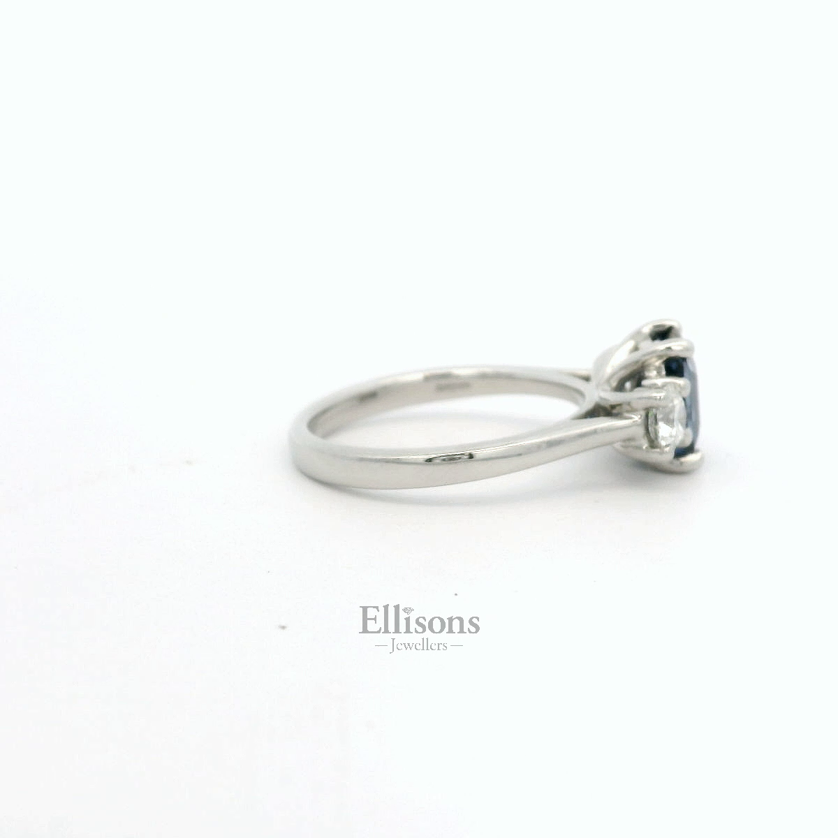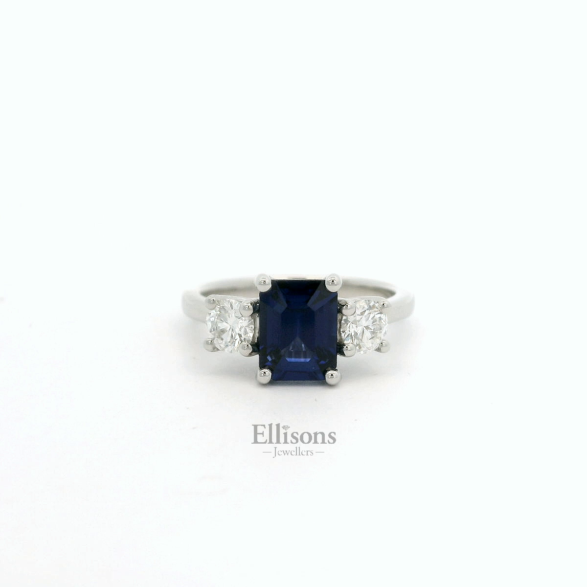 Stunningly beautiful flashes of vibrant blue radiate from this octagonal, emerald cut Sapphire. Mounted between perfectly proportioned .30ct Brilliant cut Diamonds on each side. 1.80ct Blue Sapphire ~ Ceylon origin ~ permanently enhanced by re-crystallisation diffusion