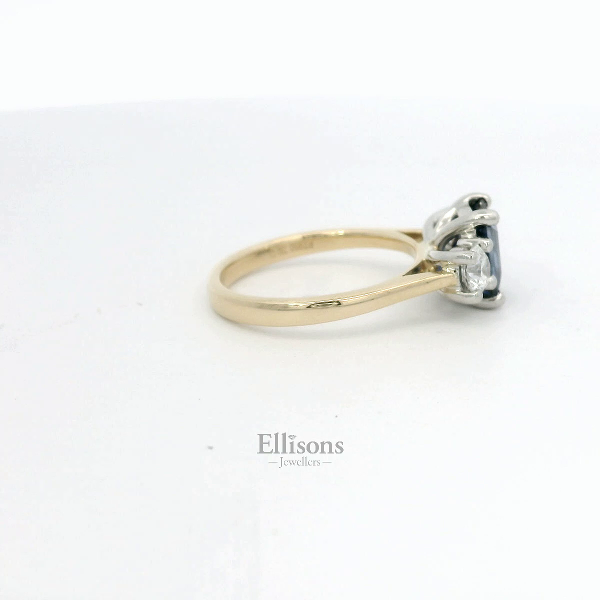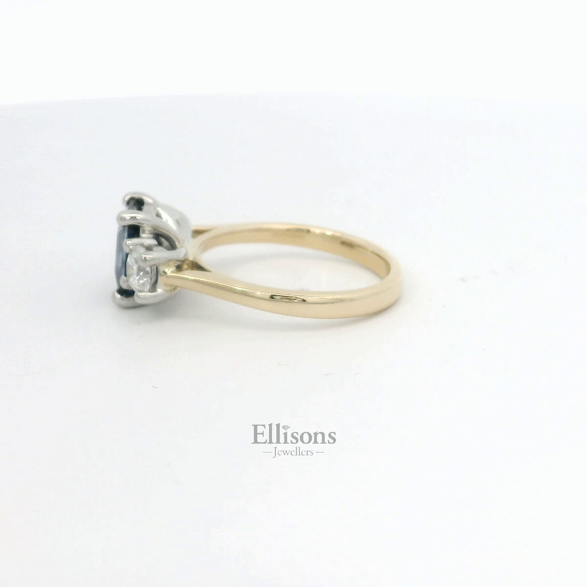 A stunning three-stone ring, contrasting vibrant, royal blue Sapphire tones with white diamond brilliance. The octagonal, emerald cut Sapphire is of Ceylon origin, permanently enhanced to optimise aesthetics. Each .30ct Brilliant cut Diamond has been Certified (E colour, Si1 clarity) by GIA. The two-tone mount features a platinum, clawed setting on an 18ct yellow gold shank. The setting is underwired and subtely raised to allow for a perfect wedding ring fit.