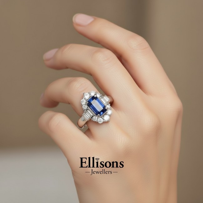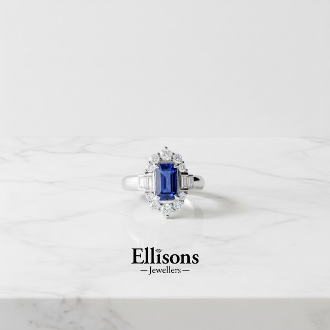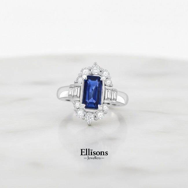This striking, oblong shaped design is influenced by an impressive, long emerald cut Sapphire, radiating shimmering tones of royal blue. Two tapering baguette cut diamonds echo the theme towards the platinum band, whilst round brilliant cuts graduate in size towards prominent centrepieces. A unique and one-off piece of exquisite jewellery design.