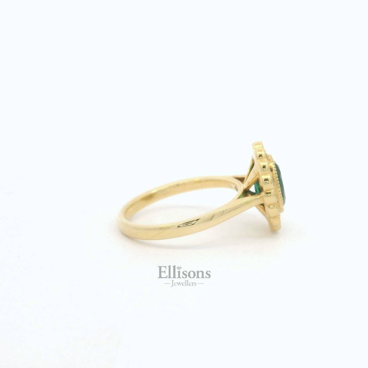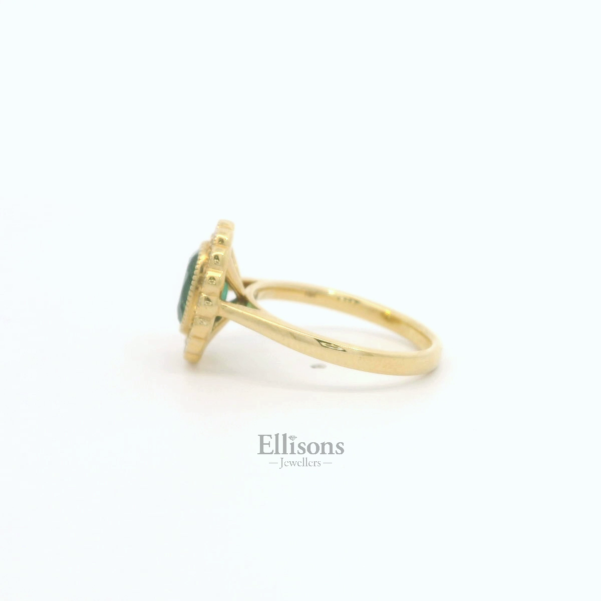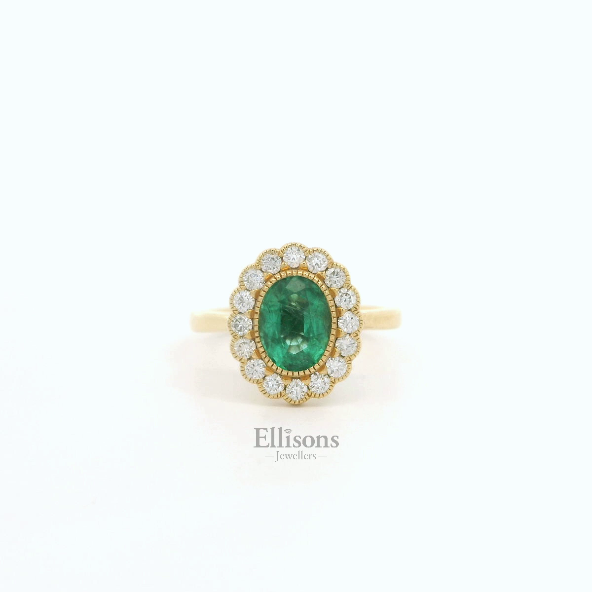 Mysterious and endearing green tones radiate from this beautiful Emerald, set flush within a millegrain beaded edge. 16 round, brilliant cut Diamonds surround and are set in a similar rubover style setting, helping to create a flower-like scalloped outline, reminiscent of vintage style era. The design is subtly modernised by allowing for a perfect wedding ring fit.