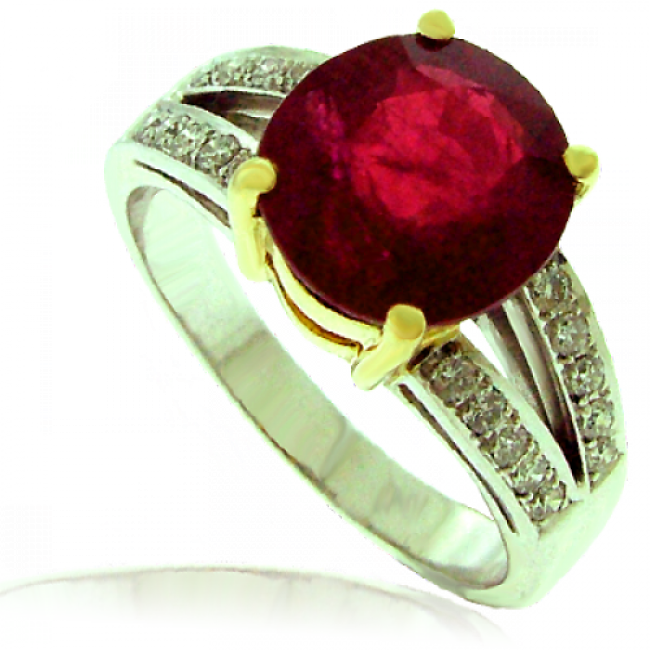 A glowing 2.80ct Ruby is complimented within its warm, yellow gold clawed setting. The spectacle contrasts effectively with the dazzling white diamonds inset in split, white gold shoulders.