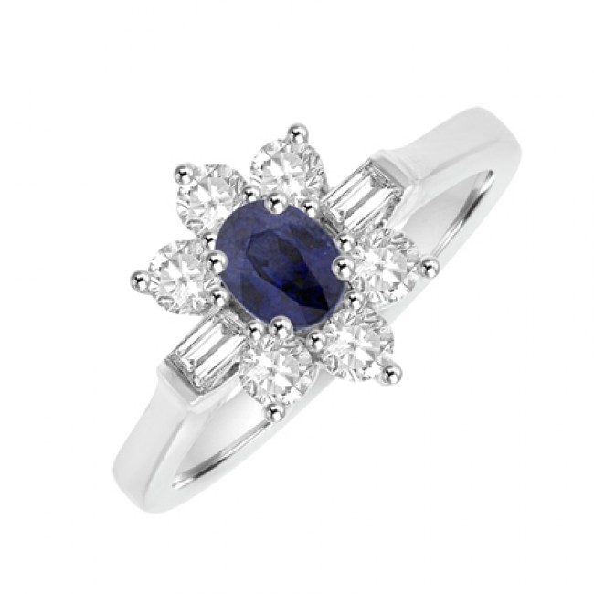 Beautifully elegant cluster featuring a round cut Sapphire in focus with six brilliant cuts and two diamond baguettes surrounding.