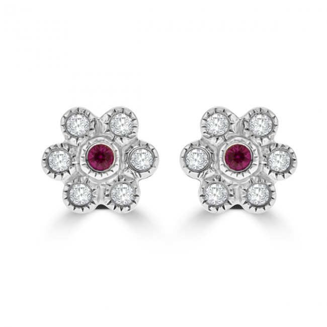 A round cut Ruby is set within a surround of six brilliant cut Diamonds. The rubover setting is diamond cut with a millgrain effect on silky white gold, to catch the light and maximise brilliance! Fit with stem and butterfly backs.