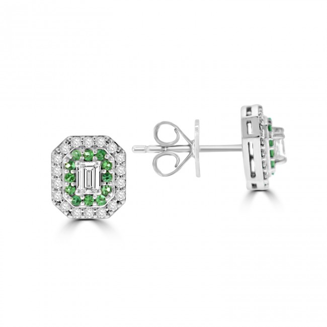 A baguette cut diamond centre is set within a double halo surround of round cut emeralds and white diamonds. Set in 18ct white gold and fitted with stem and butterfly back.