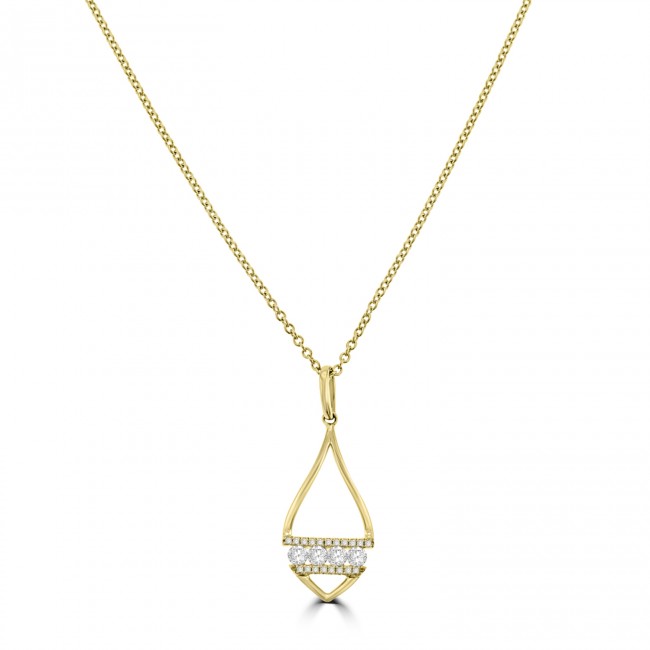 An enchanting design, radiant with majestic, 18ct yellow gold. Featuring an elegant leaf shape drop that is instersected with four Brilliant cut Diamonds between two rows of diamonds, pave set in yellow gold. The pendant is fitted on a 16" chain.