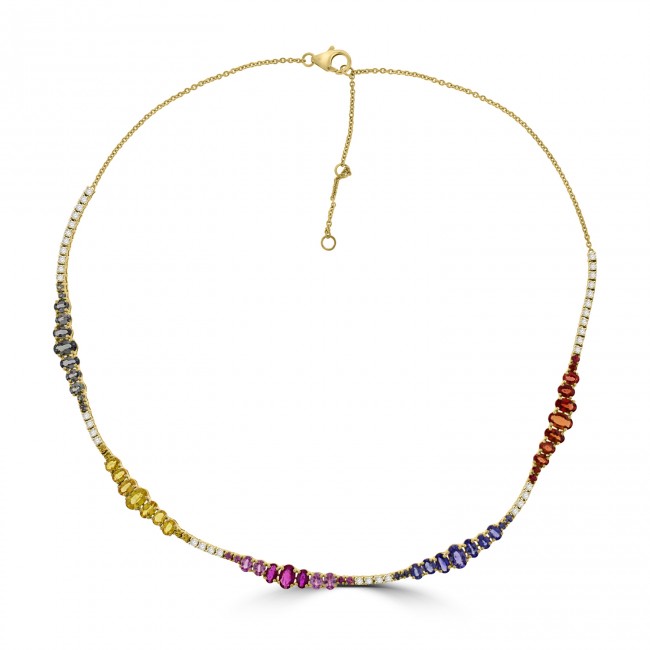 A stunning statement piece, featuring just under twelve carats of natural, precious gemstones. Sections of green, yellow, pink and blue Sapphires (9.95ct) feature graduating oval cuts in clawed settings of majestic, 18ct gold. A fifth section features 1.08ct of red Ruby. A sequence of tennis style diamond runs through the colourful spectacle and adds an exquisite sparkle to an already dazzling piece of jewellery. The necklet measures 15.5" with a 2.5" extension for choice!