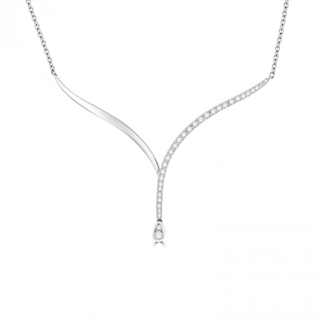 This unique and beautifully designed necklet features sold and shaped bars that combine to form an attractive V-shaped centrepiece with a pear shaped dropper. Diamonds are claw set along one side and continue down the drop to a rub-over style pendant. Including belcher chain, the collar measures approx. 16" in length and made in silky and luxurious 18ct white gold.