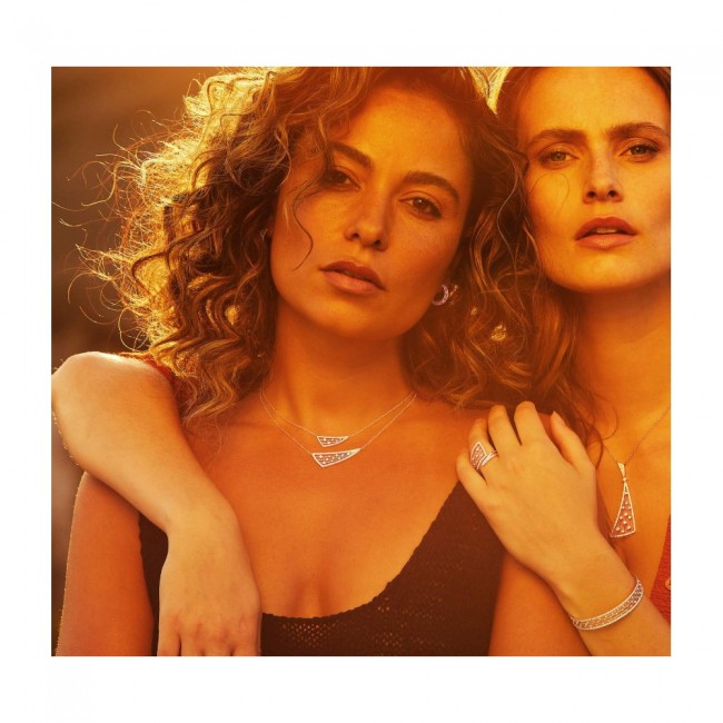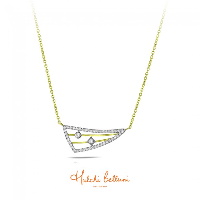 The Cheri necklet from Hulchi Belluni displays an exquisite sail shaped design, beautiful in its asymmetry. Made in rich and majesitc 18ct gold and outlined with dazzling pave diamonds. Two bars intersect the opening a feature a round and square shaped diamond setting. The pendant is fitted within a 17" belcher chain (with shortening ring). Impressive and unique Belgian design.