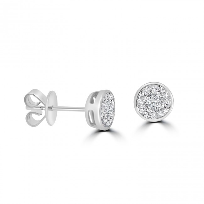 A central princess cut is surrounded seamlessly with four marquise cut diamonds to create a rounded surface, encased in a silky white gold bezel surround. The effect resembles a larger solitaire diamond. The studs are fitted by stem and butterfly backs.