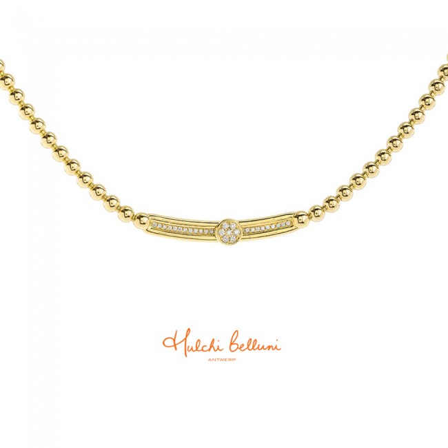 Beautifully elegant and impressively manufactured necklet, comprised of 4mm rounded beads, radiant with the rich warm tones of 18ct yellow gold. In centre focus is a curved section with a round diamond cluster which slides freely along a series of pave diamond. The Tresore Necklet by Hulchi Belluni, Belgium