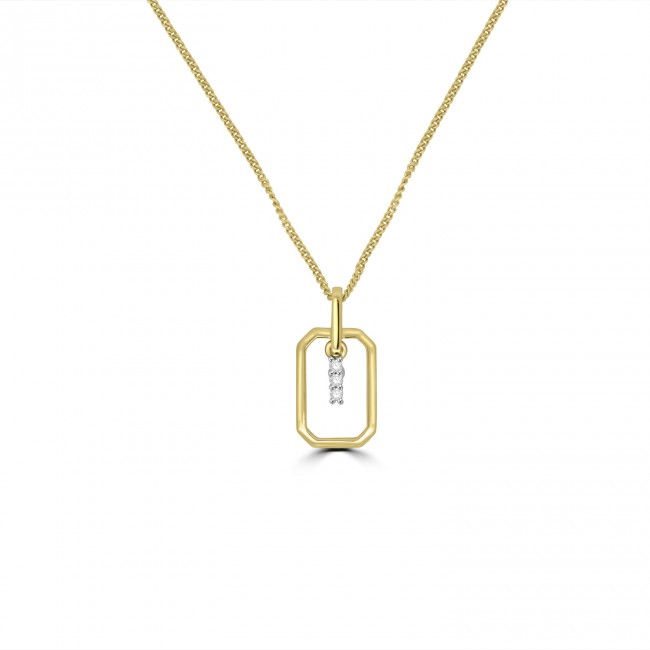 A trilogy drop of fine, white diamond is "frame" with an open oblong shape, crafted in the warm tones of 9ct yellow gold. The pendant is fitted by a plain bale to a 17" fine trace chain.