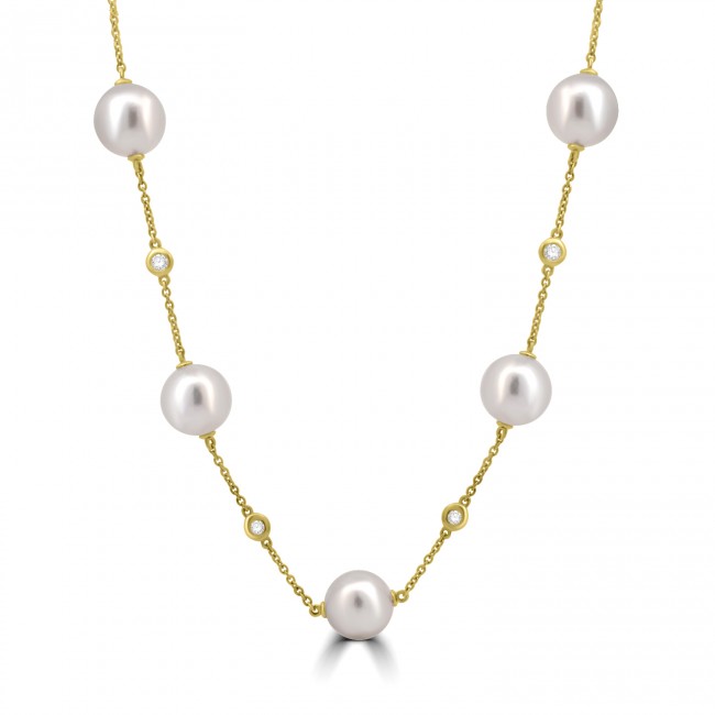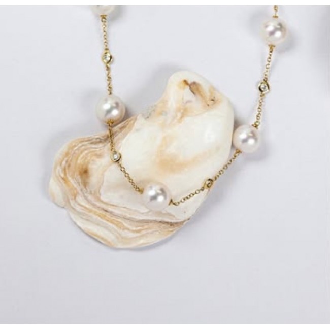 18ct Gold Akoya Pearl and Diamond 30" Station necklet