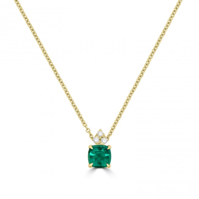 Intensely green tones radiate from a cushion cut Emerald, set within yellow gold talon claws. The white diamond brilliance from a trefoil dazzles from above. The pendant is fitted to a 16-18 belcher chain, crafted in 18ct yellow gold. Cushion cut .81ct Emerald ~ Brasilian origin ~ permanently enhanced by re-crystallisation diffusion