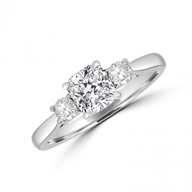 The handpicked and GIA certified Cushion cut Diamond is worthy of centre focus in this stunning three-stone ring. Its dazzling brilliance and the soft, rounded corners to its subtle square shape is both accentuated and complimented by a round, brilliant cut on each side. The platinum, clawed setting is underwired to allow for a perfect wedding ring fit.