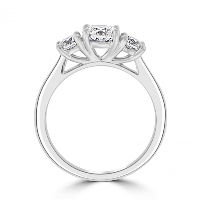 This timeless, understated design places the focus on the stunning quality of a GIA certified .75ct centre diamond, flanked by a .24ct brilliant cut on either side. The luxurious platinum setting offers a perfect wedding ring fit with a fine, elegant band.