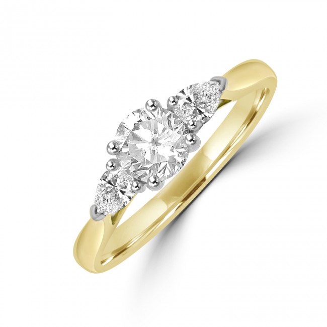 A GIA certified Brilliant cut centre stone (D colour, Si2 clarity, Excellent cut, Very Good Polish, Excellent Symmetry, Faint Fluorescence) is set between two pear cuts in luxurious Platinum. The underwired setting allows for a perfect wedding ring fit and the 1.8mm 18ct Yellow Gold shank tapers toward the diamond spectacle.