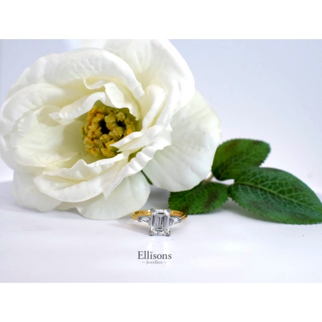 The strikingly clear depths and perfect symmetry of this emerald cut diamond is the focal point to this stunning ring. Nicely proportioned between two taper cut Baguette that graduate in width toward the fine, yellow gold shoulders. Understated and beautifully elegant in design, expertly crafted in 18ct gold with a subtle underwired setting to allow for a perfect "wedding ring fit". 1.82ct Emerald cut Diamond ~ F colour ~ Si2 clarity ~ Excellent Polish/Symmetry ~ Fluorescence None HRD Report 230000134268