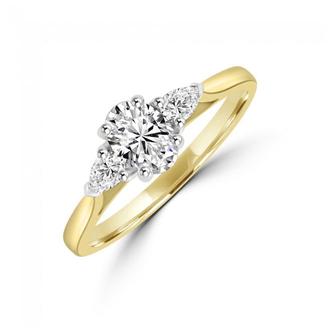 An Oval cut is perfectly proportioned between two smaller, pear cuts. Set in a subtle, clawed setting made in luxurious Platinum. The side stones taper towards the warm tones of an 18ct yellow gold shank. The mount setting is underwired to allow for a perfect fit alongside a wedding ring. Oval cut: .50ct Diamond ~ Certified EVS2 Vg Vg None ~ GIA Report: 1519554693 Measurements: 6.88 x 4.38 x 2.62mm