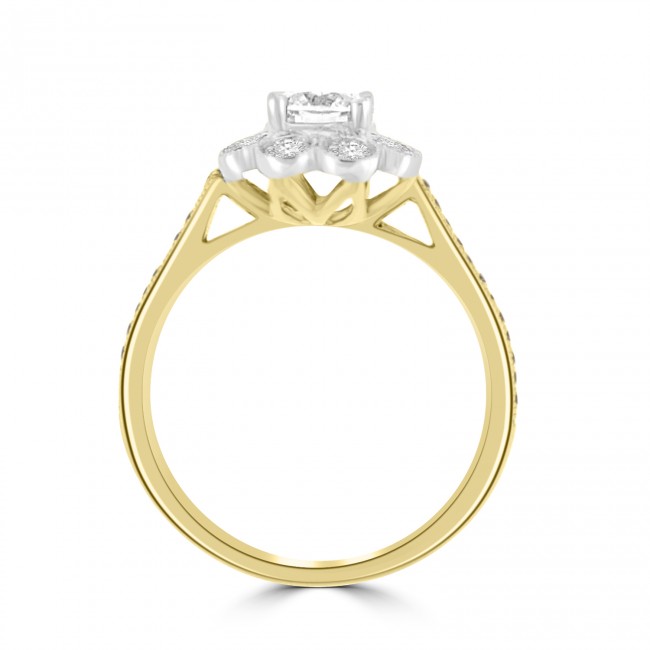 This beautiful, vintage style cluster ring is centred around a prominent .60ct Brilliant cut centre. Flattered with nine surrounding and perfectly matched diamonds with grain set diamonds continuing down the shoulders. The two tone, yellow and white gold mount is detailed with millegrain edgeing and offers a perfect wedding ring fit.