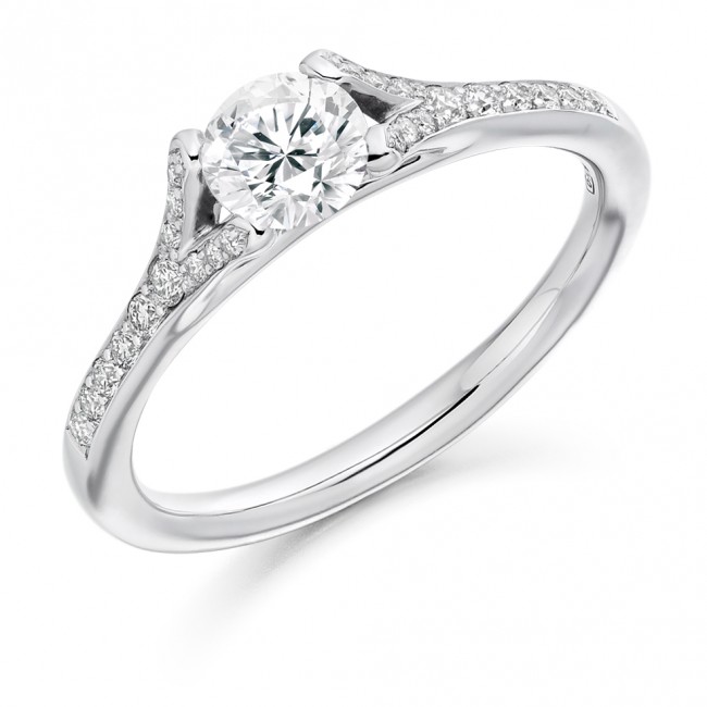 A unique and stunning setting reveals the full side of a vibrant brilliant cut diamond set between four claws, saturated in sparkle.