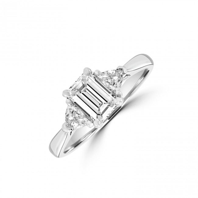 In this unique three-stone ring, the straight lines of a central Emerald cut and two outer Trillions combine to create a tapering and stunning coverage in stikingly clear diamond. The impressive centre stone has been certified by GIA. The overall Diamond weight features is 1.33ct and the understated Platinum mount is underwired for a perfect wedding ring fit. Emerald cut 1.00ct Diamond ~ GIA Report: 6352323377 Certified D Colour ~ Si1 Clarity ~ Excellent Polish/Symmetry