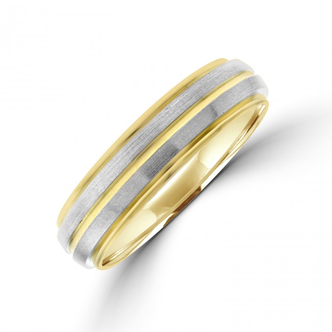 Court shaped 5mm band is made in 9ct Yellow Gold with a rounded inside for comfort fit. The top surface features two Palladium sleeves, brushed for a satin finish and separated with an attractively contrasting yellow line grooved in centre. This style is available in various widths, weights and metal combinations - please enquire for further information...