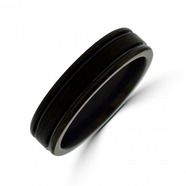 Black plated, Tungsten carbide ring with flat profle and brushed/satin sleeve in centre.