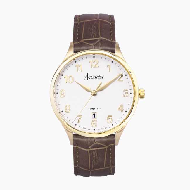 Round, ion-plated gold stainless steel case, slimline and measuring 37mm ~ Scratch resistant sapphire crystal glass ~ White dial with gold arabic numerald and date function ~ Brown, genuine leather strap ~ 2 year standard guarantee ~ 73001