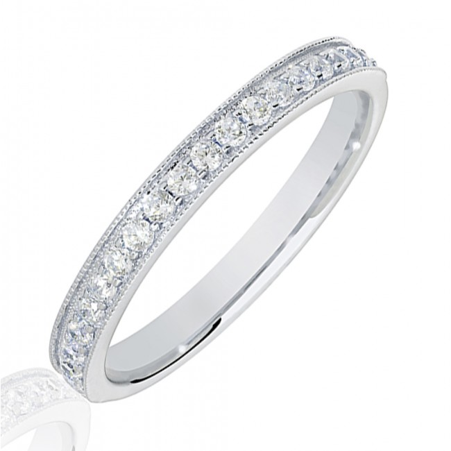 The Platinum .25ct Diamond Micro Claw Set Wedding Ring is a beautifully delicate design that offers elegant sparkle in a refined profile. Brilliant cut diamonds totalling 0.25ct are micro claw set within a slim 2.5mm platinum band, finished with a millegrain edge for added detail and vintage-inspired character.