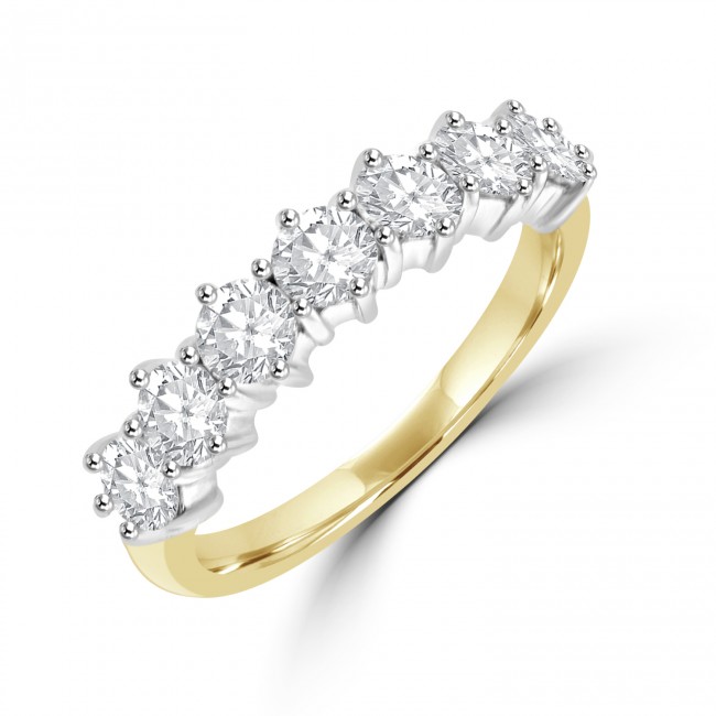 Seven brilliant cut diamonds are set flush within a 6-claw white gold setting. The two part shank features a yellow gold band.