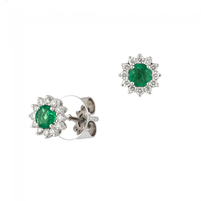 Round cut natural Emeralds are positioned within 12 Brilliant cut Diamonds, all claw set in luxurious, 18ct white gold. The impressive stud earrings are fitted by stem and butterfly back.