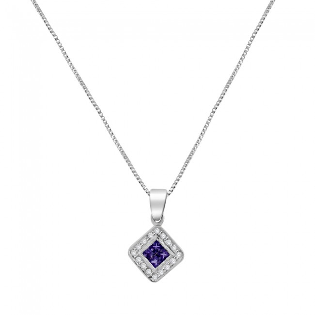 Four princess cut (square) Amethysts are seamlessly set 2x2 to create a smooth square of radiant Purple glow. This centrepiece is surrounded by grain set Diamond and the pendant is fitted by a plain bale, all made in luxurious, 18ct white gold. Please note - Sale price refers to Pendant only; Chain is sold separately. For reference, flat curb chain shown measures 16" in 18ct White Gold and sells for £150 approx. Code: 5507035