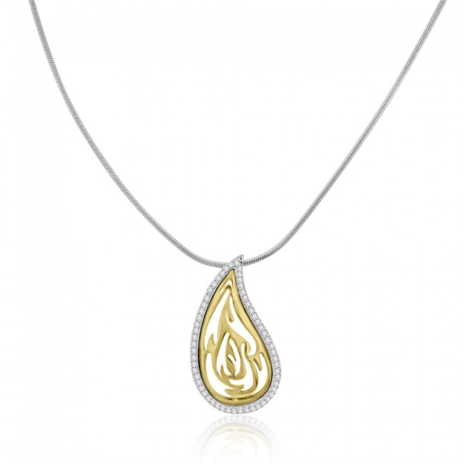 A beautifully designed pendant featuring a pear shape in majestic yellow gold, patterned with piercings. The spectacle is contrasted with a diamond surround set in silky white gold. Please note: Sale price refers to Pendant only; chain sold separately and alternative options are available.