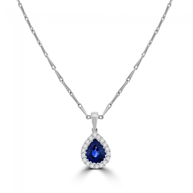 18ct White Gold Pear Sapphire Diamond Halo Pendant