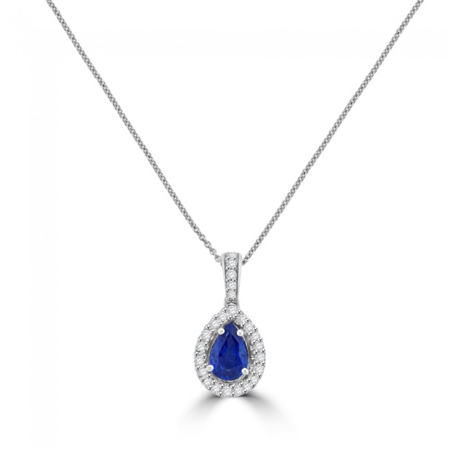 18ct White Gold Pear Sapphire Diamond Halo Pendant Chain