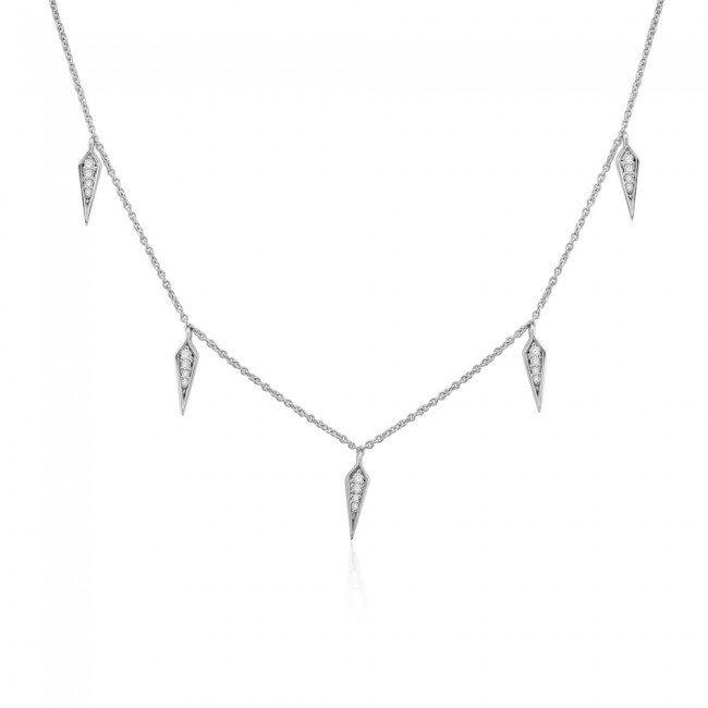 Beautifully made in silky and luxurious, 18ct white gold. The elegant and understated necklet features rings to allow it to be worn at various lengths. Five "kite" shaped droppers are positioned symmetrically at equal intervals and radiate diamond brilliance from their dazzling pave settings.