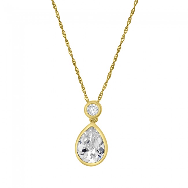 A round cut and Pear cut, white cubic zirconia stone is set in a smooth yellow gold pendant, fixed on a 17" gold chain.