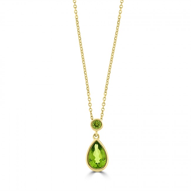 The warm, lime green tones of two natural Peridot stones are encapsulated in majestic 9ct yellow gold. The pendant bale features a round cut with a pear cut drop. The pendant is fitted on a 16" flat curb chain.
