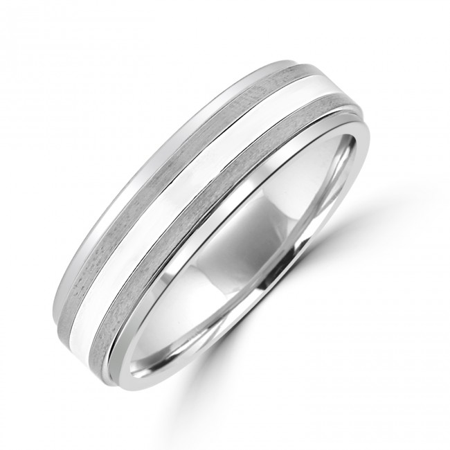 A 7mm, flat court band with an inner sleeve featuring a polished Silver band with brushed Tungsten edges.