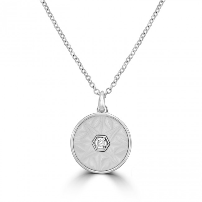 A flat, round disc is inlaid with patterned Mother of Pearl and features a white, cubic zirconia stone in centre focus. The pendant is fitted to an 18" chain with a shortening ring positioned 17".