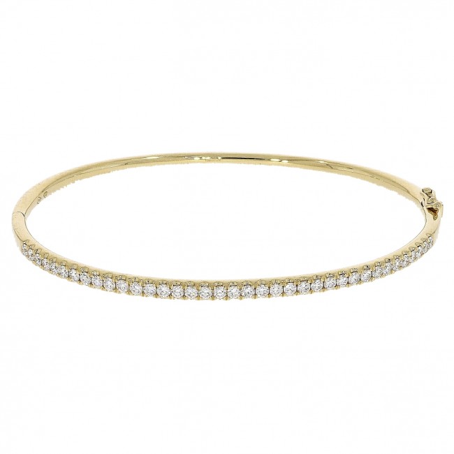 Thirty-seven brilliant cut, white diamonds are castle set in a flat court profile bangle. Hinged with a box clasp and safety catch and made in warm and majestic, 18ct yellow gold.