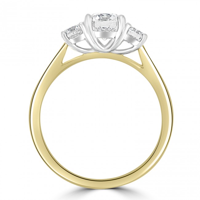 A prominent, .81ct Brilliant cut Diamond in centre focus has been certified by GIA (F colour, Si1 clarity, Very Good Cut, Excellent Polish, Excellent Symmetry, Fluorescence None). Positioned between two smaller, .18ct diamonds, the total stone weight is 1.17ct Diamond. An underwired, claw setting, made in Platinum is raised slightly to allow for a perfect wedding ring fit and set within a yellow gold band.