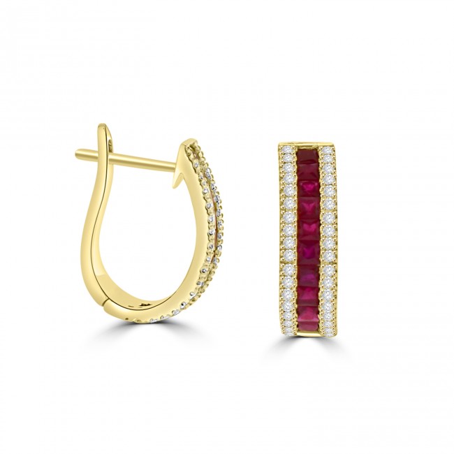 Made with the rich and majestic tones of 18ct yellow gold, these hoop earrings are hinged with a pincer style back. The curved, frontal section of the hoop is inset with two rows of micro claw set diamond, channelling a row of princess cut Rubies in centre focus.