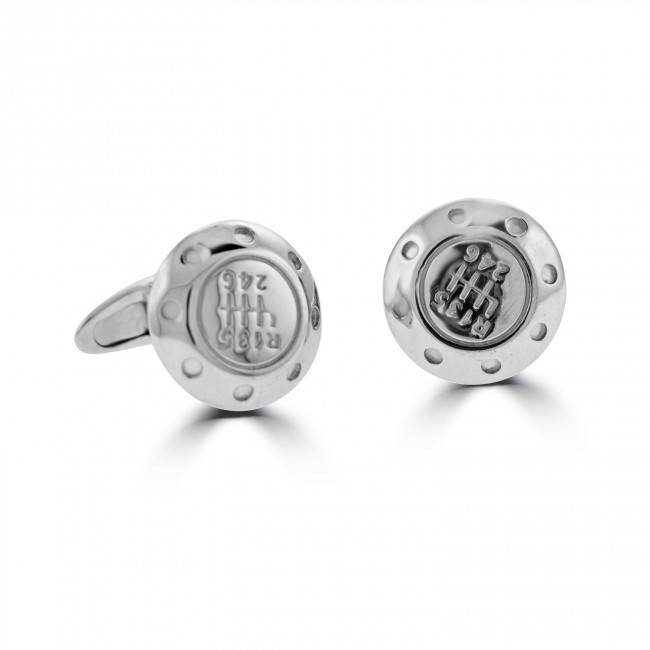 Round cufflinks with a hinged mechanism in Sterling silver. The round shaped is engraved with detail resembling the cap on a gear stick. Made in Italy.