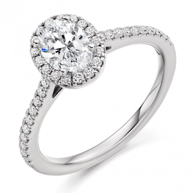 The Oval cut centre is certified by GIA (D colour, Si1 clarity, Excellent Polish, Very Good Symmetry, No Fluorescence). Claw set about a surrounding sea of brilliance from a castle set halo, a feature that continues down the platinum shoulders.