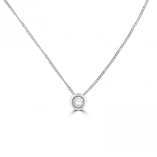 A round, brilliant cut Diamond, bezel set in a rubover pendant that slides on a 17" fine curb chain. All made in silky, 9ct white gold.
